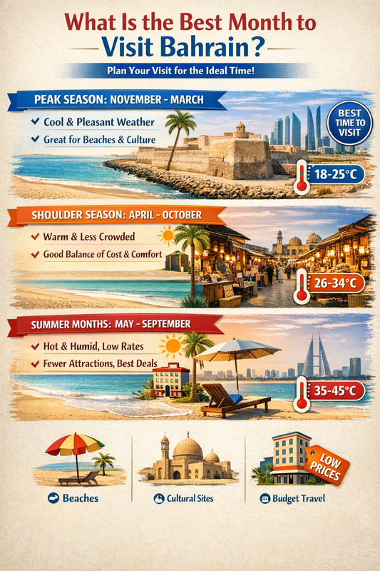 - Peak Season: November - March: It is the coolest and most comfortable season in Bahrain and the best time to walk along the beach, eat out and visit the cultural sites in the island.
