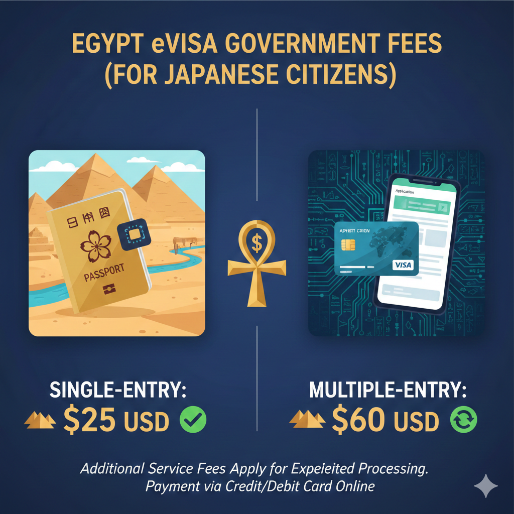 The Cost of Egypt eVisa depends on the entry type you select. For Japanese citizens, the government fees are: