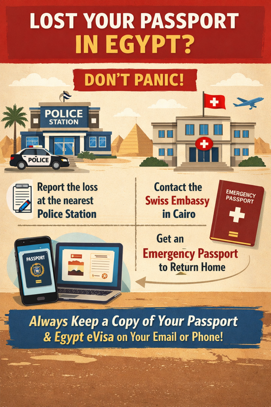 If your passport is missing or stolen, do not panic. First, go to the nearest police station and report the case. Then, contact the Swiss Embassy in Cairo. They will assist you in acquiring an emergency passport that will allow you to return home. It is always important to save a copy of your passport and Egypt eVisa on your email or phone.