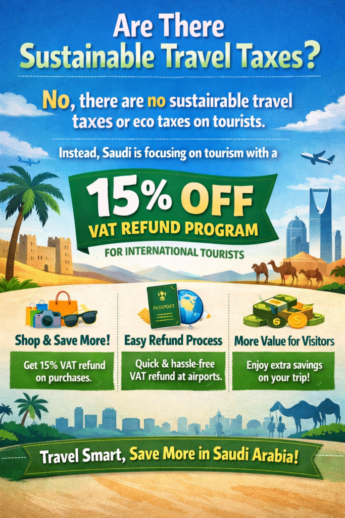 No, there are no sustainable travel taxes or eco taxes on tourists. Instead saudi is focusing on tourism with 15% off VAT refund program for international tourists