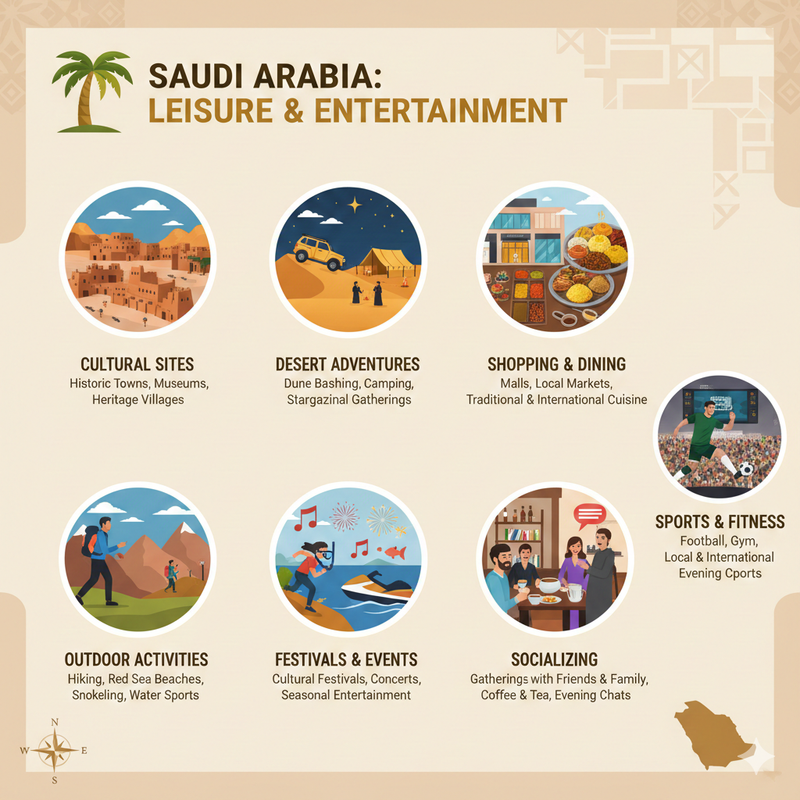Saudi Arabia is a country that combines modern entertainment and traditional experiences perfectly and provides a vast range of options for both residents and tourists. The list of common activities for one to spend their leisure time is as follows: