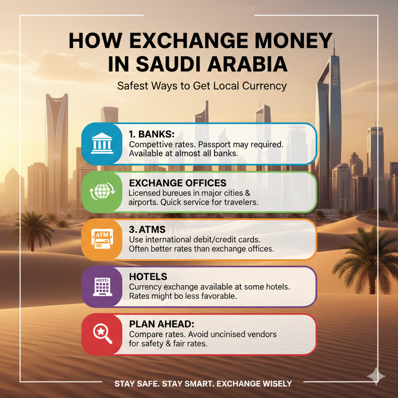 - ATMs: If you use your international debit or credit card, you can withdraw Saudi Riyals from ATMs which often have better rates than the exchange offices.