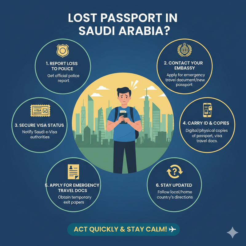 - Secure Your Visa Status – If the lost passport had your Saudi e-Visa on it, let the visa authorities know so that they can update your travel record accordingly.